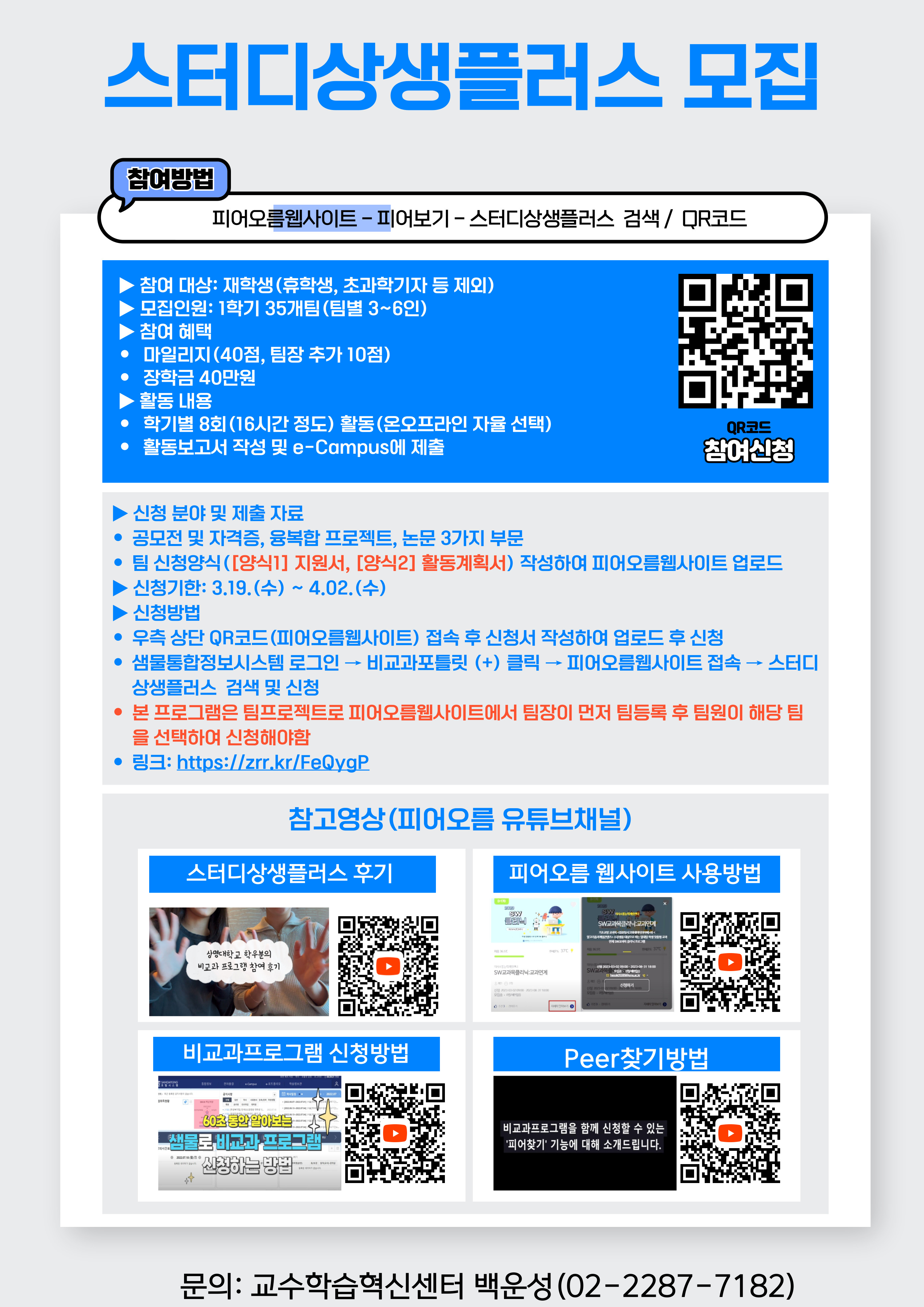 2️⃣ 샘물포털시스템 로그인 → 메인화면 → 비교과 포틀릿(+) 클릭 → 피어오름웹사이트 접속 → 스터디상생플러스 선택 및 신청(링크: https://zrr.kr/1IqHeu)